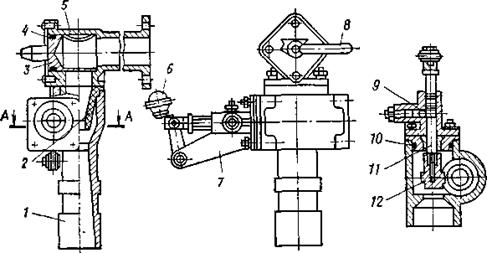Рис. 5.28. Пеносмеситель ПС-12: 1—диффузор: 2 — сопло; 3 — пробка крана; 4, 10 — уплотнительное кольцо; 5 — корпус крана; 6 — рукоятка дозатора; 7 —кронштейн; 8 — ручка крана; 9 — фиксатор; 11— шток; 12 — пробка дозатора.