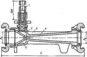 Рис. 5.29. Пеносмеситель ПС-1: 1 — всасывающий шланг; 2 — рабочая камера; 3 — корпус; 4 — диффузор; 5 — сопло.