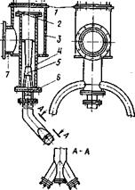 Рис. 5.38. Универсальная пеносливная камера: 1, 2 — крышка; 3 — корпус; 4 — труба; 5 — струйный насадок; 6 — подводящая труба; 7 — патрубок.