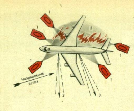 Рис. 10. Схема тушения одностороннего пожара разлитого топлива. 1 - пожарные автомобили; 2 - зона горения; 3 - пути эвакуации экипажа и пассажиров. При ударе самолета о землю возможен розлив авиатоплива вокруг аварийного судна на большой площади, достигающей сотен и даже тысяч квадратных метров. В зависимости от характера разрушения топливных баков, положение самолета и рельефа местности розлива топлива по отношению к планеру самолета могут быть односторонними и двусторонними. Наибольшую опасность и сложность для тушения и спасения, терпящих бедствие представляет двусторонний пожар разлитого топлива. Пожары разлитого авиатоплива характеризуются, как правило, быстрым распространением горения на всю площадь, высокой температурой в зоне горения (~1000оС), высокой плотностью теплового потока. Такие пожары приводят к быстрому прогоранию обшивки фюзеляжа и проникновению пожара во внутренние полости. В результате воздействия высокой температуры в не разрушенных топливных баках создаются благоприятные условия для взрыва. Взрыв может распространиться даже в несколько баков одновременно по разветвленной сети дренажных трубопроводов. При пожаре разлитого топлива происходит воспламенение шин шасси самолета, а при длительном воздействии пожара возможно воспламенение барабанов колес, выполненных из магниевых сплавов. Под действием высокой температуры возможен взрыв амортизационных стоек шасси, так как они находятся под высоким давлением. Наибольшую опасность для пассажиров и членов экипажа представляют взрывы фюзеляжных топливных баков, которые могут сопровождаться выбросом топлива и факела внутрь пассажирского салона. Взрывы мягких топливных баков в плоскости самолета носят локальный характер и не сопряжены с разбросом частей конструкции крыла и выбросом топлива. Взрыв кессонных крыльевых баков сопровождается разрушением конструкции крыла и топливной системы, что приводит к разлету обломков конструкции и одновременному выбросу большого количества топлива с последующим вытеканием его из разрушенных топливных баков. Согласно требованиям международной организации гражданской авиации за расчетный параметр принимается площадь практической критической зоны, которая связана с линейными размерами самолета, следующими соотношениями: