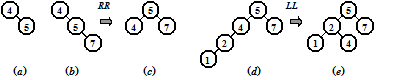 Включение ключа 3 нарушает критерий сбалансированности в узле 5 (f), и балансировка достигается двойным LR -поворотом (g). Включение узла с ключом 6 (h) приводит к четвертому типу балансировки – двойному RL -повороту. Результат – дерево (i).