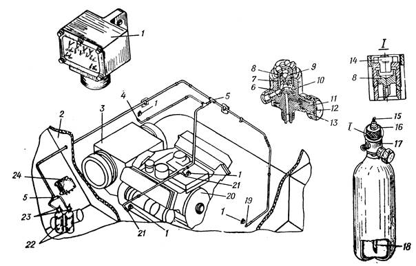 Автоматическая система ППО служит для тушения пожара в силовом отделении. Система состоит из двух баллонов 22 (рис. 154) с головками 17, трубопроводов, четырех штуцеров 4, 19, 21, четырех термодатчиков 1 и релейной коробки 24.