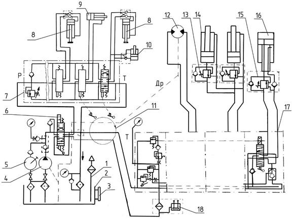 Принципиальная гидравлическая схема на примере АЛ-30(4310) и расположение всех приводов и приборов управления ими представлена на рис. 11.18, а условные обозначения на рис. 11.19. Все гидравлическое оборудование от поз.1 до поз.11 размещается на неповоротной части АЛ и АПК. Все остальное оборудование устанавливается на их поворотной части. При нейтральном положении рукояток управления гидрораспределителя 6 (см. рис. 11.18) аксиально-поршневой насос 4, включаемый КОМ, подает масло из бака 2 к гидрораспределителю и далее, как показано стрелкой, на слив в бак 2. Давление масла при этом не превышает 0, 3 МПа. Гидрораспределитель 6, кроме электропнематического управления, имеет ручное управление. Электропневматическое управление производится от щита управления. Для ручного управления на нем предусмотрена ручка. На рассматриваемой схеме показаны гидроцилиндры опор только для одного борта. На этой автолестнице выдвижение опор осуществляется гидроцилиндром 9 только на корме. Передние опоры в стороны не выдвигаются.