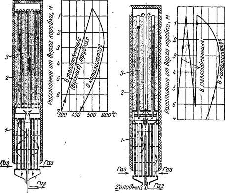 Рис.2. а. Противоточная насадка Рис. 2.б. Прямоточная насадка (здесь на рисунке изображены графики распределения температур в катализаторной коробке): /—предварительный (нижний) теплообменник; 2— катализаторная коробка; 3— теплообменные трубки катализаторной коробки.