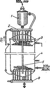 Вертикальный конденсатор также представляет собой котел, заполняемый до определенного уровня жидким аммиаком. В котле размещены змеевики 3 (трубы высокого давления). Азотоводородная смесь входит в конденсатор через верхний коллектор 2 и движется через параллельно включенные змеевики (до 12. шт.) внутренним диаметром 25—35 мм. Охлажденная газовая смесь выходит из аппарата через нижний коллектор б при температуре 10—20 °С.. Охлаждающая поверхность змеевиков-испарителей, установленных на крупных агрегатах, достигает 100 м Жидкий аммиак подается в испаритель (конденсатор) снизу, газообразный испарившийся аммиак отводится по трубке в ловушку. Здесь задерживаются капли жидкого аммиака, уносимые газом; жидкость стекает обратно в аппарат через вертикальную трубу 5.