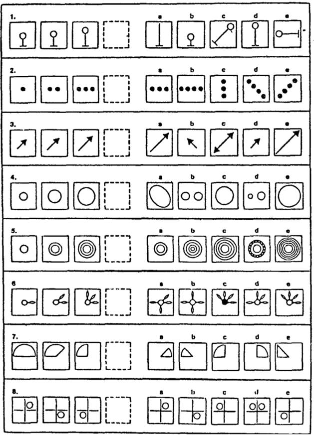 Пример 1. В каждом ряду Вам необходимо выбрать из пяти фигур справа ту, которая наиболее подходит к трем фигурам слеваСтр 1 из 2Следующая ⇒