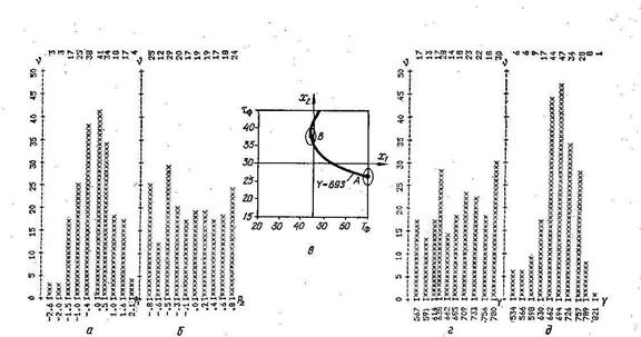 Рисунок 20 – Анализ устойчивости технологических решений (точки А и В) с помощью метода Монте-Карло: а – гистограмма генерированных случайных величин для имитации колебаний Тф; б – то же для τ ф; в – положение сравниваемых решений А и В на изолинии Y=693; г – гистограмма результирующих колебаний Y в точке А; д – то же, в точке В.
