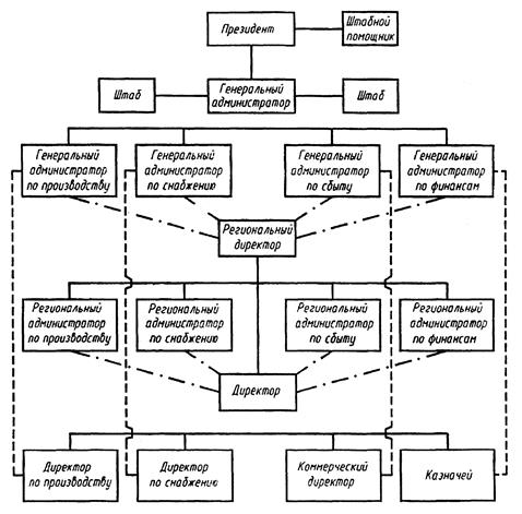 Рисунок 30 - Пример функционально-сбытовой органиграммы фирмы ------- линия прямого подчинении - - - - линия связей информационного и совещательного (консультативного) характера – ∙ – ∙ линия передачи специализированных полномочий