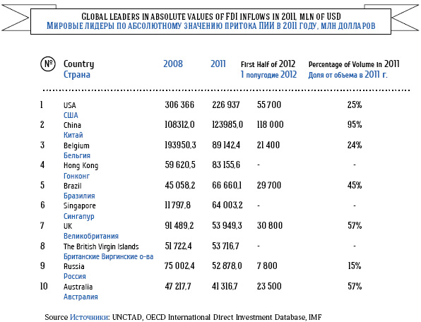 По итогам 2011 года в тройке лидеров по притокам ПИИ – США с 227 млрд долларов, Китай (124 млрд долларов) и Бельгия (89 млрд долларов). Россия с 53 млрд долларов занимает 9-е место среди стран с максимальными объемами притоков ПИИ в 2011 году. Однако, согласно оценкам, по итогам 1-го полугодия 2012 года сохранить высокие темпы привлечения ПИИ на свою территорию смог только Китай – за шесть месяцев объем поступлений составил 118 млрд долларов, или 95% от уровней 2011 года. Также стоит отметить Бразилию, которая привлекла 29, 7 млрд долларов ПИИ, или 45% от объемов 2011 года. В большинстве других стран наблюдается ощутимое снижение инвестиционной активности, и если говорить о России, то за шесть месяцев прошедшего года объем ПИИ составил всего 7, 8 млрд долларов, или 15% от объема 2011 года.