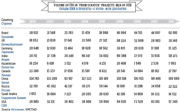 Одна из наиболее важных составляющих притока ПИИ – проекты «с нуля», когда иностранные инвесторы не покупают уже существующее предприятие, а открывают новое, что, соответственно, создает в экономике новые рабочие места. Тройкой лидеров по значению показателя в 2011 году являются Китай (100, 7 млрд долларов), Бразилия (62, 9 млрд долларов) и Индия (58, 3 млрд долларов). В России в 2011 году показатель достиг отметки в 22, 5 млрд долларов.