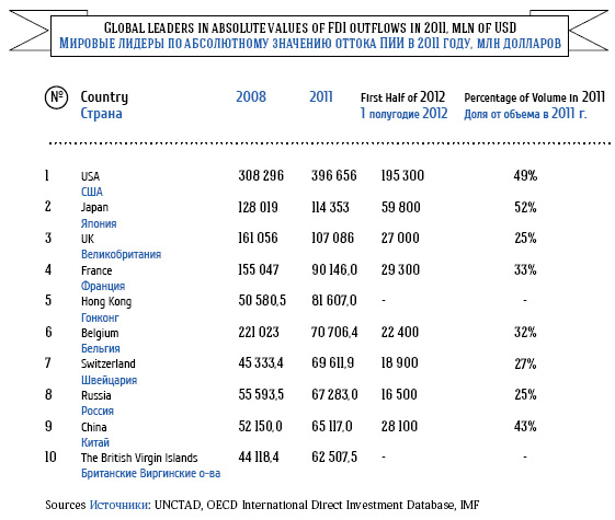 Первое место по оттоку иностранных средств в 2011 году занимают США (396, 7 млрд долларов), далее с большим отрывом следуют Япония (114, 4 млрд долларов), Великобритания (107, 1 млрд долларов) и Франция (90, 1 млрд долларов). Россия в данном списке занимает 8-е место, отток ПИИ за 2011 год составил 67, 3 млрд долларов, и это на 14, 4 млрд меньше притока средств в 2011 году.