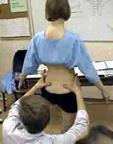 Пациент сидит. Врач располагается за пациентом, обхватывая его подвздошные кости, широко расставив пальцы. Просим пациента производить латерофлексию строго во фронтальной плоскости. Оцениваем ротационное движение таза. В норме таз ротируется в сторону латерофлексии.