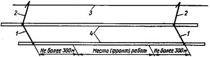 Рисунок 6. Схема заземления контактной сети при работах со сплошной сменой рельсов на участках постоянного тока: 1 — поперечные перемычки; 2 — заземляющие штанги; 3 — контактная сеть; 4 — рельсы.