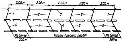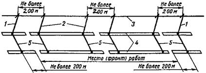 Рисунок 8. Схема заземления контактной сети при работах со сплошной сменой рельсов на участках переменного тока и наличия разрывов рельсовых нитей: 1 — основные заземляющие штанги (в начале и в конце фронта работ); 2 — дополнительные заземляющие штанги; 3 — контактная сеть; 4 — рельсы; 5 — поперечные перемычки.