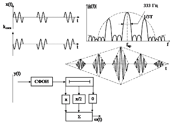 Вопрос: Какие основные элементы оптимальной обработки входят в СФ для когерентной пачки радиоимпульсов? Ответ: СФ для одиночных радиоимпульсов и когерентный накопитель на основе линии задержки с отводами и сумматора. Вопрос: Каким образом при обработке когерентной пачки радиоимпульсов учитывается изменение фазовой структуры сигнала (частоты Доплера) при отражении его от движущейся цели? Ответ: Введением в отводы линии задержки соответствующих фазовращателей. Задача №5. В РЛС осуществляется обработка отраженного от цели сигнала в виде прямоугольной когерентной пачки радиоимпульсов (τ и=1 мкс, Тп=1мс, М=3), на fпр=10 МГц, Fд=30, 25 КГц. Изобразить импульсную характеристику и АЧХ СФ, построить схему СФ, если t0=2T+τ и. Пояснить графически процесс формирования выходного напряжения.