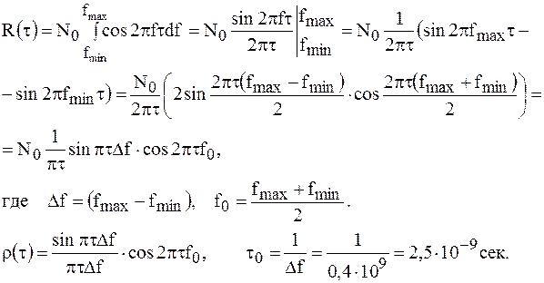 Ответ: τ 0=2, 5.10-9 сек. Задача №5. Постановщик активных помех излучает шумовую помеху, спектральная плотность мощности которой распределена равномерно в интервале частот от 100 до 200 МГц. Можно ли считать такую помеху белым шумом для приемного устройства с полосой пропускания: 1) от 150 до 180 МГц? 2) от 180 до 220 МГц? Решение Δ fПАП=200-100=100МГц 1. да, т.к. fmin ПАП< fmin РЛС и fmax ПАП> fmax РЛС 2. нет, т.к. fmax ПАП< fmax РЛС Ответ: 1. да 2. нет. Задача №6 (на дом). Гауссовский шум n(t) имеет равномерную спектральную плотность мощности N0 в интервале частот от 0 до fmax. Показать, что дискретные значения шума n(ti)=ni, отстоящие друг от друга на величину Δ t=i/2fmax, где i=1, 2, 3..., некоррелированы. Решение