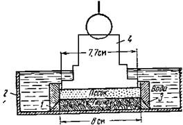 Рис.3. Принципиальная схема одометра. Кольцо Терцаги. 1 – бронзовое кольцо; 2 – сосуд; 3 – второе кольцо; 4 – поршень с гнездом для стального шарика, который передает давление от пресса на грунт