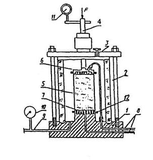 Рис. 5. Принципиальная схема установки для испытаний грунта методом трехосного сжатия 1 – основная камера; 2 – корпус камеры; 3 – вентиль для выпуска воздуха; 4 – шток; 5 – образец грунта в оболочке; 6 – верхний штамп; 7 – нижний штамп; 8 – трубка для дренирования и измерения давления в поровой жидкости; 9 – трубка для заполнения камеры и измерения давления в камере; 10 – манометр; 11 – индикатор; 12 – уплотнитель.