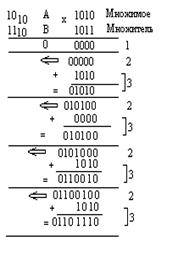 По сравнению со сложением и вычитанием, умножение – более сложная операция, как при программном, так и при аппаратном воплощении. В ВМ применяются различные алгоритмы реализации операции умножения. Умножение производится согласно таблице умножения, которая для двоичных чисел имеет вид: