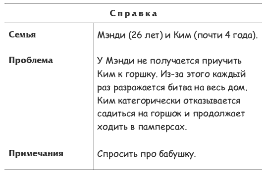 Одно из поразительных открытий относительно младенцев для меня состояло в том, что их выделения по запаху немного напоминают тесто для печенья. Может быть, это физиологические особенности исключительно наших детей, но их какашки не казались мне такими уж противными и отталкивающими. К сожалению, на каком-то этапе все кардинально меняется. Сладковатое на запах тесто для печенья превращается в то, что выглядит и пахнет как осадок на дне отстойника в Чернобыле. Внешне дети похожи на ангелов, но внутри у них, похоже, происходит нечто, имеющее отношение к радиоактивным отходам и промышленному загрязнению. Рано или поздно родители решают, что все, с них хватит. Нужно как можно меньше иметь дело с этим аспектом ухода за детьми. Дети, конечно, доставляют массу удовольствий, но вытирать им каждый раз попку — это далеко не так интересно. Мэнди тоже решила, что с нее довольно. Она хотела как можно раньше приучить Ким к горшку, а поэтому отсутствие явного прогресса она воспринимала как настоящую проблему. — Она просто напрочь отказывается садиться на горшок! — жаловалась мне Мэнди. — Мне приходится силой ее усаживать, несмотря на вопли протеста и попытки встать. Все это так действует на нервы! — Не сомневаюсь, — сказал я. — А как вы решили, что настало время приучать ее к горшку? — Мне и мама сказала, что пора. Она говорит, что мы уже самостоятельно ходили на горшок, когда нам было по три года. Ким почти четыре, а она до сих пор ходит в памперсах. «Ага, — подумал я. — Тут не обошлось без бабушки». — Значит, ваша мама считает, что Ким нужно отучать от памперсов? — Да, — кивнула Мэнди. — А что думает сама Ким? — спросил я с улыбкой. — Наверное, ничего. Она же не настолько умная. — Значит, вы решили, что ваша Ким готова, только послушав свою маму? — Да, выходит так. Но ведь ей все равно когда-нибудь пришлось бы начинать. — Да, пришлось бы. Но, судя по моему опыту, дети учатся, только когда готовы. — А что, если она никогда не будет готова? — На это можно возразить другим вопросом: а что, если будет? Мы поговорили еще, и выяснилось, что Мэнди пошла на поводу у своей матери. Не поймите меня неправильно. Бабушки и дедушки — это здорово. Это очень хорошо, но только если они занимаются своими делами. Они могут оказать неоценимую помощь, но лучше не предоставлять им право решающего голоса. Пусть дают советы, если хотят, но решение принимать не им. — Как именно вы приучали Ким к горшку? — Я сажала ее на горшок каждое утро после завтрака, пока у нее что-нибудь не получится. — Понятно. И долго она сидела? — Иногда минут двадцать. Но она отказывается ходить по-большому. Ждет, когда я ее подниму, а потом тут же пачкает подгузники. — И что вы тогда делаете? — Снова усаживаю ее на горшок. — Но ведь она уже сходила «по-большому». — Я понимаю. Но надо же ее приучить. Хм. Я посмотрел на Ким. Миленькая светловолосая девочка в маечке, на которой нарисован Винни-Пух, и в голубых джинсах с розовыми рюшечками. — Знаете, как вам избавиться от беспокойства по поводу горшка? Мэнди энергично закивала: — Да, конечно. — Перестаньте ее учить.