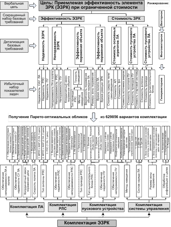 Рис. 2. Структура формирования облика (трехуровневой комплектации) СУ ЛА (ЭЗРК) на основе системы целей, требований и показателей
