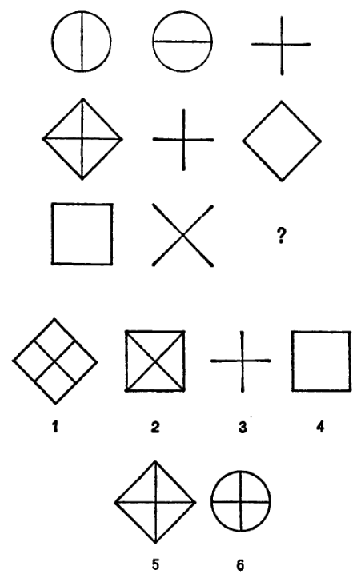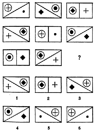 5. Вставьте пропущенное слово. СПРАВА (ПАРА) ТОРНАДО ОМЛЕТ (....) САРГАССЫ 6. Вставьте пропущенную цифру. 196 (25) 324 329 () 137 7. Какое число следующее в серии? 18 10 6 4? 8. Найдите лишнее слово. ЛУСТ ФАШК ТИНОП ВЕРОК 9. Выберите правильную фигуру из шести пронумерованных.