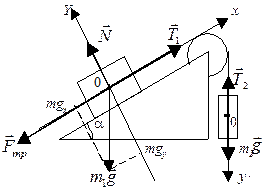 Задача 2. На вершине клина укреплен невесомый блок. Через блок перекинута нерастяжимая и невесомая нить, к концам которой прикреплены грузы массами EMBED Equation.3 = 1 кг и EMBED Equation.3 = 10 кг. Коэффициент трения груза m1 о плоскость равен 0, 1. Угол плоскости клина с горизонтальной плоскостью равен 30(. Определить ускорение грузов и силу натяжения нити (рис.2.2).