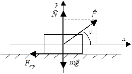 Задача 3. Определить силу трения, действующую при движении тела по горизонтальной поверхности, если на тело массой m = 1 кг действует сила 10 Н под углом a = 60° к горизонту. Коэффициент трения равен m = 0, 1. С каким ускорением будет двигаться тело (рис.2.3)?