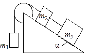 Задача 11. Три груза массами EMBED Equation.3 = 1 кг, EMBED Equation.3 = 2 кг и EMBED Equation.3 = 3 кг связаны нитью, перекинутой через блок (рис.2.13). Плоскость образует с горизонтом угол (= 30(. Найти ускорение и силу натяжения нити, связывающей грузы, находящихся на наклонной плоскоскости. Коэффициент трения (= 0, 02. Ответ: EMBED Equation.3 EMBED Equation.3 ; T = 7,