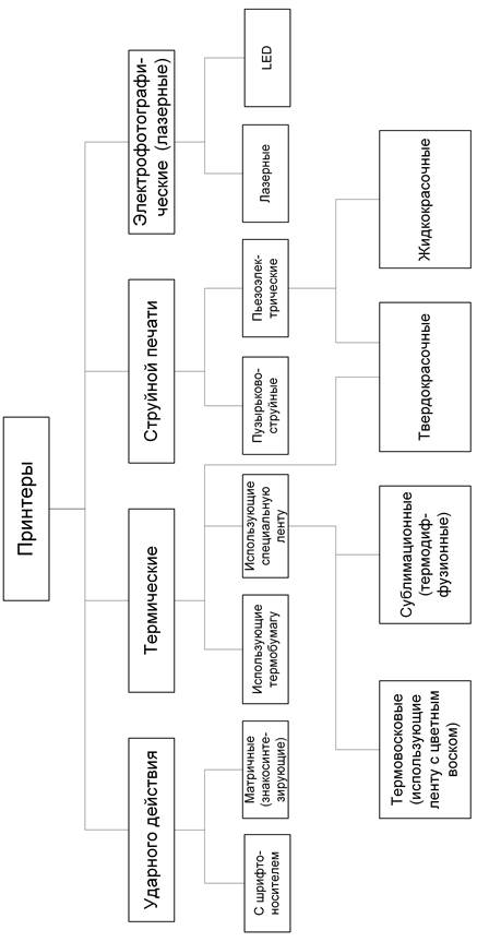 Рис.5.1. Классификация современных принтеров по технологии печати Матричные принтеры ударного действия наносят изображение на бумагу или иной носитель путем удара через красящую ленту специальными иголками, расположенными в виде ряда или прямоугольника (матрицы). Поскольку выводимые символы образуются одновременными ударами по ленте некоторой комбинацией иголок, в принтерах данного типа можно получить при печати шрифты различного начертания и размера, а также сложные изображения. Однако при данной технологии невозможно получить качественную цветную печать, да и символьную также. Матричные (называемые еще игольчатыми) принтеры (Dot Matrix Printer) долгое время являлись стандартным устройством вывода для РС. Достоинства этих принтеров определяются, в первую очередь, их универсальностью, которая заключается в способности работать с любой бумагой, а также низкой стоимостью печати. Если необходим принтер, который должен целый день без перерыва печатать различные формуляры, то целесообразно использовать именно матричный принтер. Матричный принтер может иметь либо печатающую головку, либо печатающую планку (в последнем случае принтер называют строчным). В печатающей планке строчного принтера размещено столько иголок, сколько необходимо для формирования матрицы строки. Поэтому строка печатается целиком за один такт, что дает скорость печати до 1500 строк в минуту (примерно 20 страниц в минуту). Этот тип принтеров обеспечивает механическое копирование с помощью копировальной бумаги, что делает их востребованными в банках. При струйной печати изображение формируется из капель краски, каким-либо образом доставляемых на бумагу или иной носитель. Струйные принтеры обеспечивают относительно матричных высокое качество печати. При использовании данной технологии легко организовать цветную печать. Струйные принтеры работают практически бесшумно, могут печатать не только на бумаге, но и на специальных пленках для проекторов или для последующего перевода изображения на ткань. Несмотря на дорогие расходные материалы, струйные принтеры являются очень распространенными. Термические принтеры разделяются на две группы: использующие специальную термобумагу; осуществляющие доставку красителя на обычную (не покрытую специальным слоем) бумагу. В термических принтерах, использующих специальную термобумагу, в печатающей головке устанавливаются нагревательные элементы, которые нагревают нужные точки на бумаге. Бумага покрыта пленкой, в которой находятся компоненты красителя. В точке нагревания компоненты вступают в реакцию, в результате которой образуется видимое вещество – точка. В настоящее время они применяются для печати товарных этикеток со штрих-кодами, в факсимильных аппаратах, в контрольно-кассовых аппаратах, POS-терминалах, копи-досках, принтерах для ноутбуков и карманных ПК. Такие принтеры имеют низкое разрешение и малую скорость печати. Развитием этой технологии стали твердочернильные (твердокрасочные), термовосковые и сублимационные принтеры. Твердочернильные принтеры используют струйный перенос расплавленного красителя (поэтому мы их отнесли также и к струйным принтерам). Общим для двух последних технологий является нагрев красителя и перенос его на бумагу в жидкой или газообразной форме. Термовосковые принтеры п