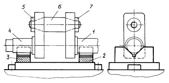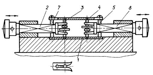 На рис.3.1 показано приспособление для сборки составного коленчатого вала. Приспособление обеспечивает соосность коренных шеек 1и 4. Их установка осуществляется в центрирующих призмах 2 и 3. После этого производится затяжка гаек 5 и 7, которые крепят шатунную шейку 6. На рис.3.2 представлена схема приспособления для сборки зубчатой передачи прибора. В отверстие закреплённой в приспособлении нижней пластинки 1 вводят поддерживаемые пружинными вилками ползунов 2 и 8 валы-шестерни 3 и 4. После наложения верхней пластины 6 и закрепления последней винтами 5 и 7 ползуны отводятся назад в крайнее положение.
