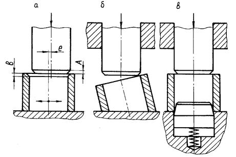 Большое значение для достижения точности при сборке, осуществляемой с помощью установочных приспособлений, имеет известный принцип определённости базирования деталей в приспособлении. При соединении, например, вала и втулки (рис.3.3) сопряжение возможно лишь в случае определённости базирования обеих деталей, при котором смещение е (рис.3.3, а) осей деталей не превышает наименьшей величины зазора плюс сумма величин фасок вала А и втулки В. Выполнить такое условие по схеме, показанной на рис.3.3, а очень трудно, т.к. втулка, свободно расположенная на опорной плите, может занимать множество положений. Неточность обработки опорного торца втулки (рис.3.3, б) также может быть причиной несобираемости из-за погрешности относительного поворота осей деталей. В обоих рассмотренных случаях имеет место неопределённость базирования собираемых деталей. Этот недостаток устранён в схеме на рис.3.3, в, где обе детали базируются по поверхностям сопряжения.
