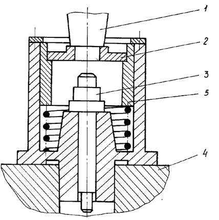 При сборке прессовых соединений необходимо обеспечить хорошее центрирование объединяемых деталей. Это требование выполняется за счёт использования в сборочных приспособлениях направляющих и центрирующих устройств. На рис.3.5 показано приспособление для устранения перекоса при запрессовке тонкого диска 2 на вал 3. Направление диска осуществляется гильзой 5. Приспособление устанавливают на стол пресса 4. Запрессовка производится ползуном 1 до упора. Наиболее удачным способом базирования деталей в сборочном приспособлении является их базирование по поверхностям сопряжения. В этом случае обеспечивается минимальная погрешность установки. При сборке шатунно-поршневой группы необходимо обеспечить соосность сопрягаемых поверхностей деталей (поршень – шатун –палец) в сборочном приспособлении. Схема базирования деталей при сборке представлена на рис.3.6.