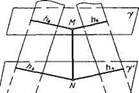£ и ᵦ -пересекающиеся плоскости, ᵞ и ᵞ ' - вспомогательные горизонтальные плоскости, h - горизонтали на отметках 6 и 4 MN- линия пересечения плоскостей
