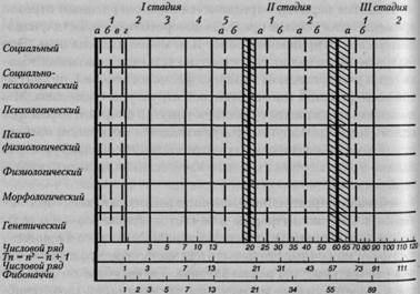 Рис. 3.1. Онтогенетическая сетка «•—»• границы между стадиями; «—» — периодами; «-----------» — фазами. Стадии обозначены римскими цифрами, периоды — арабскими, фазы — строчными буквами. о А Ганзен и др. К системному описанию онтогенеза человека составлении сетки мы исходим из положения Б. А. Ананьева о целостности и единстве человека как индивида, субъекта деятельности, личности и индивидуальности на всех этапах онтогенеза. Под сеткой мы понимаем графическое изображение уровневых и временных отношений онтогенеза. Сетка образована совокупностью горизонтальных и вертикальных линий, отражающих особенности онтогенетического развития в соответствии с понятиями «стадия», «период», «фаза». Для построения сетки уровневых и временных отношений онтогенеза используем семь уровней, описанных в литературе. Каждая из семи горизонтальных параллельных линий соответствует одному из уровней: генетическому, морфологическому, физиологическому, психофизиологическому, психологическому, социально-психологическому, социальному. Ось времени, на которой отмечены границы онтогенеза, расположена горизонтально. Вопрос о границах онтогенеза вызывает в литературе дискуссии. Так, Геккель ограничивал онтогенез только эмбриональным периодом. А. Н. Северцов расширил понятие онтогенеза до возникновения взрослого половозрелого состояния. И наконец, Крыжановский, а также А В. Нагорный, В. Н. Никитин, И. Н. Буланкин считают, что с понятием онтогенеза необходимо связывать всю совокупность последовательных изменений организма от оплодотворенной яйцеклетки до старости и смерти. Таким образом, заточку отсчета онтогенеза примем начало внутриутробного развития, т. е. оплодотворение яйцеклетки. При определении конечной точки онтогенеза тоже встречаются трудности. Длительность жизни представляет собой признак вида. Для млекопитающих, в том числе для человека, максимальная длительность жизни составляет 118-120 лет, по данным работы — 100-120 лет. Для удобства представления экспериментальных данных шкалу времени выберем / = 100 VF, гДе Т — время жизни в годах, / — расстояние от 0 до соответствующей точки на шкале. Попытаемся выделить и охарактеризовать границы основных этапов онтогенеза. Периодизация онтогенеза затрудняется сложностью самого процесса развития, его неравномерностью ЧАСТЬ III. Периодизация психического развития (проявляющейся в разном темпе развития и созревания функции в разные фазы онтогенеза), а также гетерохронностью, разновременностью созревания и развития. Б. Г. Ананьев пишет о том, что зрелость человека как индивида (физическая зрелость), как личности (гражданская), как субъекта познания (умственная) и труда (трудоспособность) во времени не совпадают. Об этом свидетельствуют и современные данные развития опорно-двигательного аппарата, сердечно-сосудистой системы, эндокринного статуса и нервной системы, а также примеры пространственно-различительных функций, функции внимания, памяти, мышления, психомоторных функций, реактивности организма. Вследствие неравномерности, гетерохронности и различия индивидуальных темпов развития и созревания граница между стадиями не может быть точечной, а занимает некоторый временной интервал. Причем индивидуальные различия нарастают в онтогенезе от ранних фаз к более поздним. На это указывает Б. Г. Анан