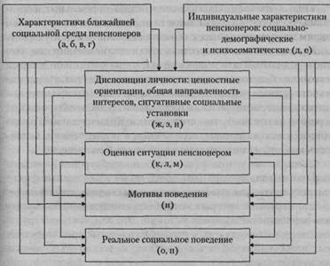 ЧАСТЬ VII. Психология геронтогенеза или социальной инфраструктуры, уровень благоустройства и развития сферы обслуживания населения, обеспеченность транспортными коммуникациями); б) характеристики производственной среды пенсионеров (сфера и отрасль занятости, характер, содержание и условия труда, размер заработка, условия выплаты пенсии — льготные или нельготные, удаленность работы от места жительства, продолжительность рабочего времени, отношение непосредственного руководителя и коллектива к пенсионеру); в) характеристики семейно-бытовой среды (состав, структура и размер семьи, совместность или раздельность проживания с родственниками, отношение последних к пенсионеру, материальная или иная помощь, оказываемая ему семьей, ее душевой доход, жилищные и коммунальные условия); г) характеристики общественной среды (тип и структура общественной организации, членом которой состоит пенсионер или в которой выполняет общественные поручения, ее территориальная и административная локализация, удаленность от места жительства, отношение ее руководства и коллектива к пенсионеру); д) социально-демографические характеристики пенсионеров (пол, возраст, состояние в браке, образование, специальность или профессия, должностное положение, квалификация, партийность, общий трудовой стаж, стаж фактического пребывания на пенсии, ее размер); е) состояние здоровья пенсионеров^; Этот показатель фиксировался по самооценке опрашиваемых пенсионеров. Такой метод, часто применяющийся в социальной геронтологии, основан на достаточно тесной корреляционной зависимости между самооценкой и объективными медицинскими показаниями, что было обнаружено специальными исследованиями как советских, так и зарубежных ученых (см.: Виноградов Н. А. и др. Образ жизни и здоровье людей пенсионного возраста. В кн.: 9-й Международный конгресс геронтологов. Киев, 1972, т. 2. С. 263-266; Дыскш< А. А. Пылина Т.М. Состояние здоровья и его самооценка при продолжении профессионального труда в пожилом возрасте. В кн.: Профессиональный груд в пожилом возрасте. Л. 1976. С. 55-GO; 3eudpwtbiu П., Круминьш Ю. Некоторые характеристики старых людей Латвийской ССР. В кн.: Пожилые люди в нашей стране. М, 1977. С. 70-79; ШанасЭ. Самооценка физического состояния пожилыми людьми: сравнение по 6 странам. В кн.: 9-й Международный конгресс геронтологов, т. 2. С. 192-195). В- Д. Шапиро. Концепция социального поведения личности... 477 ж) ценностные ориентации личности (общие и в отдельных сферах — труда, семьи, общественной деятельности, досуга); з) общая направленность интересов личности в ту или иную сферу деятельности; и) социальные установки личности, связанные с различными жизненными обстоятельствами, важными для пенсионеров (например, с профессиональной переквалификацией, принятием материальной помощи от детей, выбором общественного поручения); v.) оценки ситуаций, требующих принятия пенсионерами определенных решений (например, о раннем или отложенном выходе на пенсию, о позитивных и негативных последствиях предстоящего прекращения работы); л) показатели удовлетворенности или неудовлетворенности своим положением на производстве, в семье, в общественной организации или образом жизни как работника и как пенсионера в целом; м) мнения пенсионеров о деятельности различных институтов и организаций, связанных с социальным об