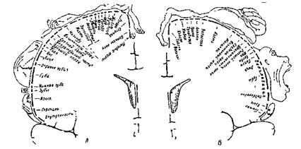 А) конвекситальная поверхность коры б) медиальная (срединная) поверхность коры (Цифрами обозначены поля. Сплошными линиями помечены границы полей, пунктирными подразделения внутри поля) Исследованиями доказано, что " ядро" двигательного анализатора, базируется в двух центральных извилинах: передней (поля 4, 6) и задней (поля 1, 3), где осуществляются функции высшего анализа и синтеза двигательных раздражений. Как видно, и это необходимо подчеркнуть еще раз, что двигательный анализатор представлен одновременно передними отделами коры (моторная зона в передней цен-тральной извилине) и задними отделами коры (кожно-кинестетическая зона в задней центральной извилине), которые характеризуются существенно отличными структурными и функциональными особенностями, а также закономерностями взаимодействия с другими мозговыми образованиями. Очевидно, что без знания особенностей строения и учета закономерностей функционального взаимодействия различных корковых отделов мозга, принимающих участие в организации психомоторных актов, не может получить научное обоснование и быть эффективной система работы по формированию психомоторики. Не могут быть также объективно выявлены и верно квалифицированы двигательные отношения, установлены их место и роль в структуре дефекта, правильно определены уровень и специфика психомоторного недоразвития в целом. Без этих знаний не могут быть также вскрыты причины и механизмы двигательных нарушений, степень их включенности и влияния на межсистемные функциональные расстройства и т.д., что в свою очередь не позволит обеспечить в каждом конкретном случае адекватность коррекционно-педагогических мероприятий. Сказанное определяет значимость и необходимость рассмотрения морфологической и физиологической (психофизиологической) организации психомоторики при ее нормальном и патологическом функционировании. Основываясь на литературных данных, представляем в нижеследующих разделах морфофункциональные особенности упомянутых выше передних и задних отделов коры, входящих в состав двигательногo анализатора и обеспечивающих психомоторную деятельность человека.