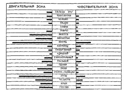 Как известно, в заднюю центральную извилину, расположенную в теменной доле, в так называемой постцентральной области коры, проецируются рецепторы, заложенные в органы движения (мышцы и связки) и приносящие в кору кинестетические ощущения, то есть ощущения от положения и движений тела, его частей, работы мышц, а также кожные ощущения. Именно задняя центральная извилина, если использовать терминологию И.П. Павлова, должна считаться двигательным анализатором в узком смысле слова, а по определению Г.И. Полякова (1959), она является кожно-кинестетическим анализатором, ядерную зону которого, по его мнению, составляют поля 3, 1, 2 (рис. 2). Как уже было отмечено выше, А.Р. Лурия называет эту область мозговой коры " сензорным" отделом в составе двух совместно работающих зон двигательного анализатора. Исходя из различий клинической картины при поражении указанных полей, Г.И. Поляков выделяет одно, занимающее центральное, или первичное, положение в ядерной зоне, таковым является поле 3 (выделено нами-В.Д.). Обычно при повреждении этого центрального поля наблюдаются, как правило, резко выраженные симптомы нарушений в восприятии ощущений наиболее тонких дифференцировок соответствующих двигательных и кожных раздражителей. Обнаружено (Г.И. Поляков, 1959; И.И. Филимонов, 1957 и др.), что первичное поле 3, как и центральные поля других ядерных зон (зрительной, слуховой), резко выделяется своеобразием своей цитоархитектонической картины, заключающемся в особенностях нейронного строения, обеспечивающего двусторонние корково-подкорковые связи, наиболее прямым и коротким путем соединяющие кору с рецепторами. В центральных полях, указывает Г.И. Поляков, особенно многочисленны зерновидные клетки слоя IV, переключающие импульсы, приходящие по мощно развитым афферентным проекционным волокнам из подкорковых отделов анализаторов, на пирамидные нейроны слоев III и V коры. Г.И. Поляков (1962) также отмечает, что важнейшей чертой структурной и функциональной организации первичного поля 3 является наличие в нем четкой соматотопической проекции, при которой отдельные точки периферии (кожной поверхности, скелетной мускулатуры тела) проецируются в строго ограниченные соответствующие точки первичных полей, получивших в связи с этим название " проекционных полей". Установлена важная закономерность, что соматотопическая проекция строится в первичных полях коры не пропорционально величине частей и участков тела, а пропорционально их функциональному назначению. Так, наибольшей протяженностью и объемом отличаются участки коры, куда проецируются кожные и мышечные рецепции пальцев рук и кисти, органов артикуляции, характеризующиеся наиболее выраженной способностью дифференциации отдельных мельчайших раздражений (рис.1, рис.3). В связи с указанной закономерностью Г.И. Поляков заключает, что " первичные поля ядерных зон представляют собой у человека высокоспециализированные участки коры, позволяющие весьма дробно выделять отдельные мельчайшие раздражители, что является, - по его мнению, - совершенно необходимым условием синтетического восприятия сложных комплексов раздражителей", приходящих от кожно-кинестетических рецепторов (А.Р. Лурия, 1962, С.43). Однако, замечает Г.И. Поляков, " наличие строго разграниченных отдельных пунктов проекций в пределах первичных полей следуе