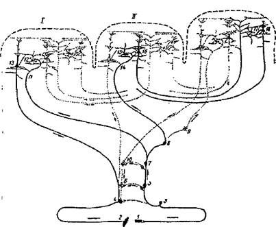 Рис.4. Система связей первичных, вторичных и третичных полей коры (по Г.И. Полякову, 1959) / - первичные (центральные) поля; // - вторичные (периферические) поля 111 - третичные поля (зоны перекрытия анализаторов).
