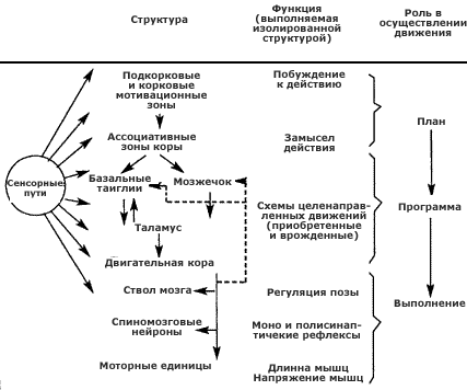 | Общий план организации двигательной системы (по Дж. Дуделу с соавт., 1985). Важнейшие двигательные структуры и их основные взаимосвязи указаны в левом столбце. Для простоты все чувствительные пути объединены вместе (кружок слева). В среднем столбце перечислены самые главные и твердо установленные функции, обнаруженные при раздельном изучении каждой из этих структур. В правом столбце указано, каким образом эти функции связаны с возникновением и выполнением движения. Следует обратить внимание на то, что базальные ганглии и мозжечок расположены на одном уровне, а двигательная кора участвует в превращении программы движения в его осуществление