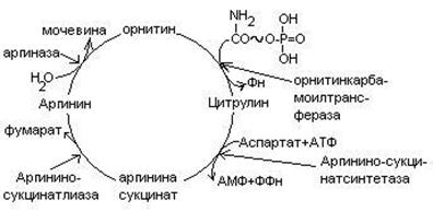 Эта реакция обратная окислительному дезаминированию глутаминовой кислоты. Дальше глутамат связывает еще одну молекулу NH3 и дают глутамин. Глу+NH3 Глутамин используется почками как резервный источник аммиака, необходимый для нейтрализации кислых продуктов обмена при ацидозе. 3. Образование аммонийных солей. Аммиак в почках акцептирует протон кислоты, образуя аммонийную соль. Одновременно этот процесс обеспечивает сбережение организмом ионов Na+, которые в отсутствие ионов аммония выводились бы с анионами кислот. NH3+Н+Cl- 4. Биосинтез мочевины. Мочевина – главный конечный продукт обмена азота в организме. С мочой за сутки выводится 25-30 г мочевины. Синтез мочевины идет в печени. Превращение аммиака в мочевину осуществляется в форме цикла. Цикл мочевины открыли Ганс Кребс и Курт Хенселайт (1932г). Первая аминогруппа, поступающая в цикл мочевины, получается в виде свободного аммиака при окислительном дезаминировании глутамата в митохондриях клеток печени. Эта рекция катализируется глутаматдегидрогеназой, для действия которой требуется НАД+ Глутамат+НАД++Н2О Аммиак соединяется с двуокисью углерода с образованием карбомоилфосфата. Реакция требует затраты АТФ. Катализирует эту реакцию карбомоилфосфатсинтетаза. На следующей стадии карбомоилфосфат взаимодействует с орнитином с образованием цитрулина. Образовавшийся цитрулин переходит из митохондрий в цитозоль клеток печени. Цитрулин взаимодействует с аспартатом в присутствии АТФ с образованием аргининсукцината. Эта реакция катализируется аргининсукцинатсинтетазой. На следующей стадии аргининсукцинат расщепляется с образованием аргинина и фумарата. Фумарат возвращается в пул промежуточных продуктов цикла лимонной кислоты. На последней стадии аргинин под действием аргиназы расщепляется на мочевину и орнитин. Регенерированный орнитин вновь поступает в митохондрии. Мочевина из клеток печени поступает в кровь и через почки выводится с мочой.