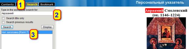 В указатели вы также можете провести полнотекстовый поиск нужной вам информации. Для этого выберите вкладку «Search» на панели управления, затем впишите в текстовом поля текст запроса, после нажмите кнопку «Search». В соответствии с вашим запросом в окне поиска отобразятся странички, в которых содержится текст вашего запроса, щелкните по ним и с правой стороны окна отобразиться страничка персоны (см. рис 2).