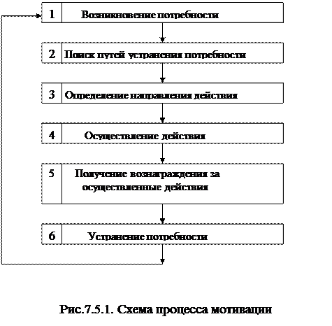 Мотивация, рассматриваемая как процесс, теоретически может быть представлена в виде шести стадий, следующих одна за другой (рис. 7.5.1). Естественно, такое рассмотрение процесса носит условный характер, так как в реальной жизни нет столь четкого разграничения стадий и нет обособленных процессов мотивации. Однако для уяснения того, как разворачивается процесс мотивации, каковы его логика и составные части, представленная модель может быть приемлема и полезна. Первая стадия - возникновение потребности. Потребность проявляется в виде того, что человек начинает ощущать, что ему чего-то не хватает. Проявляется она в конкретное время и начинает «требовать» от человека, чтобы он нашел возможность и предпринял какие-то шаги для ее устранения. Потребности могут быть самыми различными. Условно их можно разбить на три группы: физиологические, психологические, социальные. Вторая стадия - поиск путей устранения потребности. Раз потребность возникла и создает проблемы для человека, он начинает искать возможности устранить ее: удовлетворить, подавить, не замечать. Возникает необходимость что-то делать, что-то предпринять. Третья стадия - определение целей (направления) действия. Человек фиксирует, что и какими средствами он должен сделать, чего добиться. На данной стадии происходит увязка четырех моментов: что я должен получить, чтобы устранить потребность; что я должен сделать, чтобы получить то, что желаю; в какой мере я могу добиться того, что желаю; насколько то, что я могу получить, может устранить потребность. Четвертая стадия - осуществление действия. На этой стадии человек затрачивает усилия для того, чтобы осуществить действия, которые, в конечном счете, должны дать возможность получить что-то, чтобы устранить потребность. Так как процесс работы оказывает обратное влияние на мотивацию, то в процессе осуществления действия на этой стадии может происходить корректировка целей. Пятая стадия - получение вознаграждения за осуществленные действия. Проделав определенную работу, человек либо непосредственно получает то, что он может использовать для устранения потребности, либо то, что он может обменять на желаемый для него объект. На данной стадии выясняется, насколько выполнение действий дало желаемый результат. В зависимости от этого происходит либо ослабление, либо сохранение, либо усиление мотивации к действию. Шестая стадия - устранение потребности. В зависимости от степени снятия напряжения, вызываемого потребностью, а также от того, стимулирует ли устранение потребности ослабление или усиление мотивации к деятельности, человек либо прекращает деятельность до возникновения новой потребности, либо продолжает искать возможности и осуществлять действия по устранению потребности. Знание логики процесса мотивации не дает существенных преимуществ в управлении этим процессом. Можно указать на несколько факторов, которые усложняют и делают неясным процесс практического развертывания мотивации. Сильным фактором является неочевидность мотивов. Можно предполагать или догадываться, какие мотивы действуют, но в явном виде их «вычленить» невозможно. Требуются длительные и скрупулезные наблюдения для того, чтобы попытаться с достаточной степенью достоверности сказать о том, какие мотивы являются ведущими, движущими в мотивацио