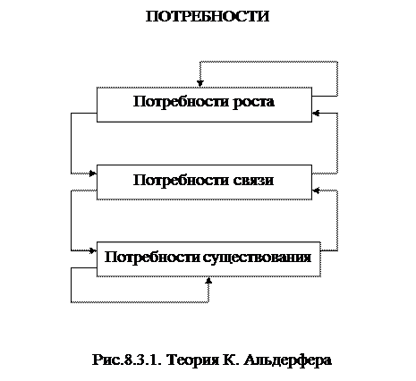 Так же как и А. Маслоу, Клейтон Альдерфер (1972) исходит в своей теории из того, что потребности человека могут быть объединены в отдельные группы. Однако в отличие от теории иерархии потребностей А. Маслоу он считает, что таких групп потребностей существует три: 1) потребности существования; 2) потребности связи; 3) потребности роста. Эта теория достаточно наглядно соотносится с теорией А. Маслоу. Потребности существования как бы включают две группы потребностей пирамиды А. Маслоу: физиологические потребности и потребности безопасности, за исключением групповой безопасности. Группа потребностей связи наглядно корреспондирует с группой потребностей принадлежности и причастности. Потребность связи, по К. Альдерферу, отражает социальную природу человека, стремление быть членом семьи, иметь коллег, друзей, начальников и подчиненных. Поэтому к данной группе можно отнести также часть потребностей признания и самоутверждения из пирамиды А. Маслоу, связанных со стремлением человека занимать определенное положение в окружающем мире, а также ту часть потребностей безопасности пирамиды А. Маслоу, которые связаны с групповой безопасностью. Потребности роста аналогичны потребностям самовыражения пирамиды А. Маслоу и включают также те потребности группы признания и самоутверждения, которые связаны со стремлением к развитию уверенности, самосовершенствованию и т.п. Эти три группы потребностей также расположены иерархически. Однако между теориями А. Маслоу и К. Альдерфера есть одно принципиальное отличие, состоящее в том, что, по А. Маслоу, происходит движение от потребности к потребности только снизу вверх. К. Альдерфер считает, что движение идет в обе стороны: вверх, если удовлетворена потребность нижнего уровня, и вниз, если не удовлетворяется потребность более высокого уровня. При этом К. Альдерфер считает, что в случае неудовлетворенности потребности верхнего уровня усиливается степень действия потребности более низкого уровня, т.е., если, например, человек никак не смог удовлетворить потребности роста, у него опять «включаются» потребности связи. В соответствии с теорией К. Альдерфера иерархия потребностей отражает восхождение от более конкретных потребностей к менее конкретным. Он считает, что каждый раз, когда потребность не удовлетворяется, происходит переключение на более конкретную потребность. И этот процесс определяет наличие обратного хода сверху вниз.