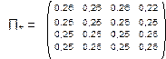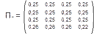 Пусть для определенности в начальный момент времени автомат находился в состоянии 1, и совершил действие 1, соответствующее этому состоянию. С помощью равновероятного выбора по матрице П+ перешел в состояние 4. И пусть после этого он получил сигнал штраф. Получение такого сигнала заставляет автомат считать свой переход 1 – 4 ошибкой. Эта информация фиксируется следующим образом. Вероятность П+14 уменьшается на D, а все остальные элементы строки увеличиваются на D/3. Для удобства положим D = 0.03. Тогда после этого шага матрица П- не изменится, а матрица П+ будет выглядеть так: На очередном шаге автомат делает действие 2, соответствующее состоянию 4, и выбирает очередное состояние на основании матрицы П- (т.к. в текущем акте общения со средой он находится в условиях последнего сигнала от среды – штрафа).