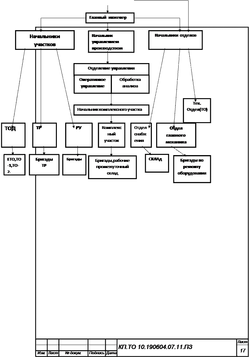 Я выбрал метод централизованного управления производством. Так как среди прочих методов организации ТО и ремонта в настоящее время он является наиболее прогрессивным. Сущность этого метода заключается в формировании производственных подразделений по технологическому признаку (метод технологических комплексов) с внедрением централизованного управления производством (ЦУП). Система ЦУП основывается на следующих принципах. 1. Четкое распределение административных и оперативных функций между руководящим персоналом и сосредоточение функций оперативного управления в едином центре или отделе управления производством (ЦУП или ОУП). Основными задачами ЦУП являются сбор и автоматизированная обработка информации о состоянии производственных ресурсов и объемах работ, подлежащих выполнению, а так же планирование и контроль за деятельностью производственных подразделений на основе анализа имеющемся информации. 2. Выполнение каждого вида технического воздействия при организации производства ТО и ремонта подвижного состава специализированной бригадой или участком (бригады ЕО, ТО-1, ТО-2, ТР и др.)- технический принцип формирования производственных подразделений в наибольшей степени отвечающий требованиям централизованной системы управления. 3. Объединение производственных подразделений (бригад, участков), выполняющих технологически однороднее работы, в производственные комплексы в целях удобства управления ими. 4. Централизованная подготовка производства (комплектование оборотного фонда запасных частей и материалов, хранение и регулировка запасов, доставка агрегатов, узлов и деталей на рабочие посты, мойка и комплектование ремонтного фонда, обеспечение рабочих инструментом, а также перегон автомобилей в зонах ТО, ремонта и ожидания) осуществляется специальным комплексом. Централизация подготовки производства значительно сокращает непосредственные потери времени ремонтных рабочих, управленческого персонала и в конечном счете простои автомобилей в ТО и ремонте. 5. Использование средств связи, автоматики, телемеханики и вычислительной техники (система может активно работать лишь при наличии средств диспетчерской связи и оргтехники).