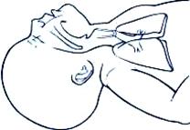 Ребенка следует уложить на спину или бок со слегка разогнутой шеей в положение «чиханья», что выведет заднюю стенку глотки, гортань и трахею на одну линию и будет способствовать неограниченному доступу воздуха. Такое выравнивание наилучшим способом поможет проведению вспомогательной вентиляции мешком и маской и/или введению