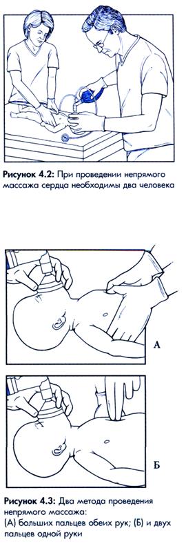 Помните, что закрытый массаж сердца принесет мало пользы, если он не проводится одновременно с вентиляцией легких. Поэтому для его проведения нужны два человека — один для надавливания на грудную клетку, а второй для продолжения вентиляции. Лицо, осуществляющее массаж сердца, должно иметь свободный доступ к грудной клетке с возможностью правильно положить на нее свои руки. Лицо, проводящее вспомогательную вентиляцию, должно занять положение у головки ребенка (рисунок 4.2). Как надо расположить руки на грудной клетке перед началом непрямого массажа сердца? Вы познакомитесь с двумя методами непрямого массажа сердца. Это методы ô Больших пальцев обеих рук ô Двух пальцев одной руки (среднего и указательного или безымянного) При использовании первого варианта оба больших пальца рук надавливают на грудину, а кисти обхватывают торс с остальными пальцами, поддерживающими позвоночник (рисунок 4.3А). Если ребенок крупный, а кисти рук у вас маленькие, то нужно удостовериться, что новорожденный лежит на жесткой поверхности. При втором методе подушечки среднего и указательного или безымянного пальцев одной кисти надавливают на грудину, а другая рука используется для поддержки спинки ребенка, если только новорожденный не лежит на очень твердой поверхности (рисунок 4.3Б).