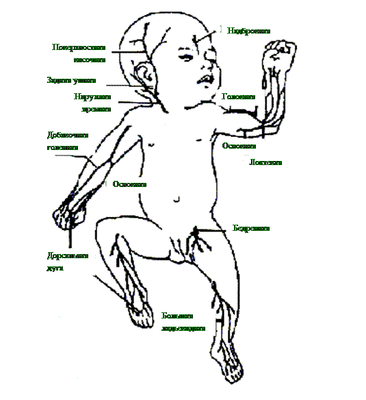 Рис.5-6: Периферические вены, наиболее часто использующиеся для пункции и катетеризации у новорожденных