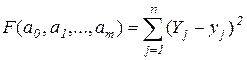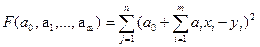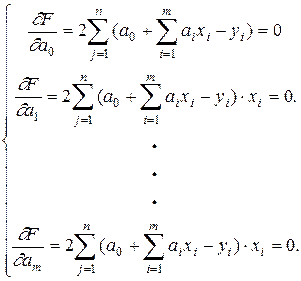 Поскольку условием существования экстремума функции (4) является равенство частных производных по каждой переменной (искомым коэффициентам) нулю, то для отыскания минимума функции F приравнивают нулю соответствующие частные производные:
